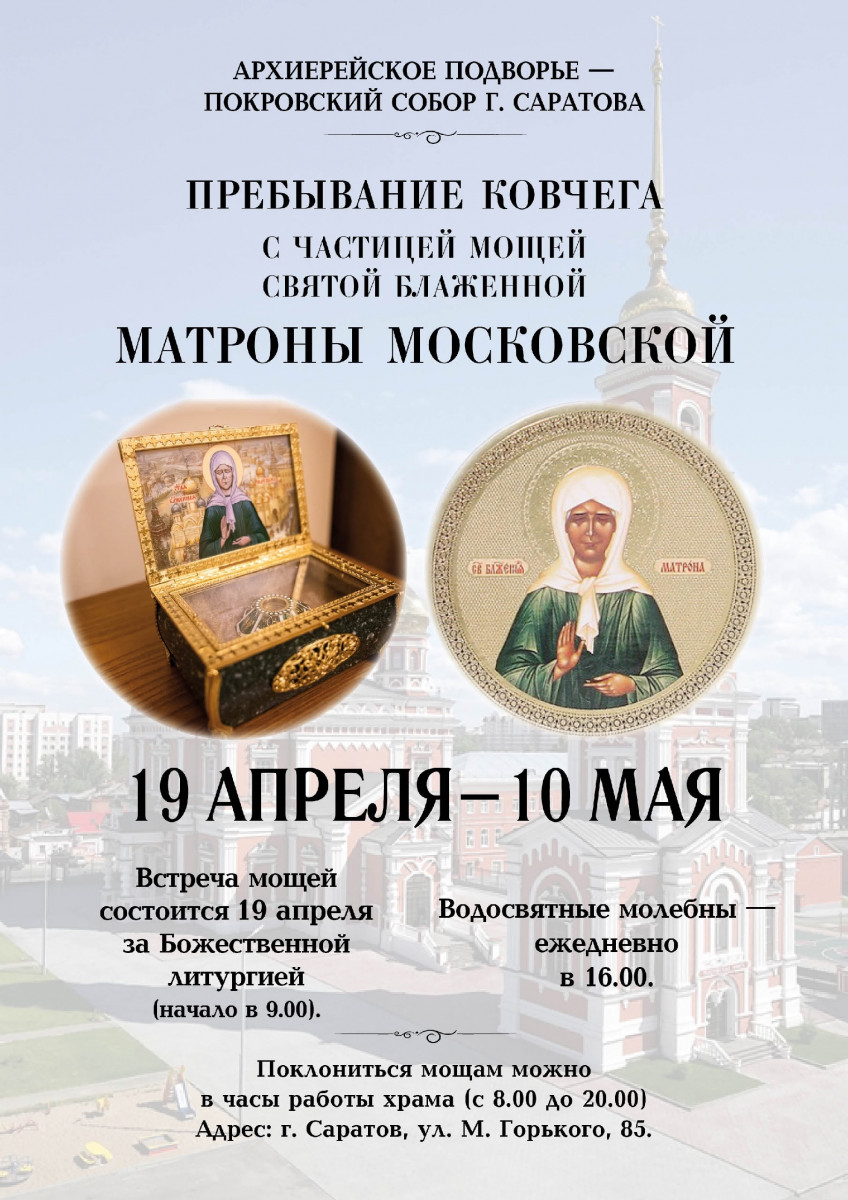 В ПОКРОВСКИЙ СОБОР Г. САРАТОВА ПРИБУДЕТ КОВЧЕГ С ЧАСТИЦЕЙ МОЩЕЙ СВЯТОЙ БЛАЖЕННОЙ МАТРОНЫ МОСКОВСКОЙ