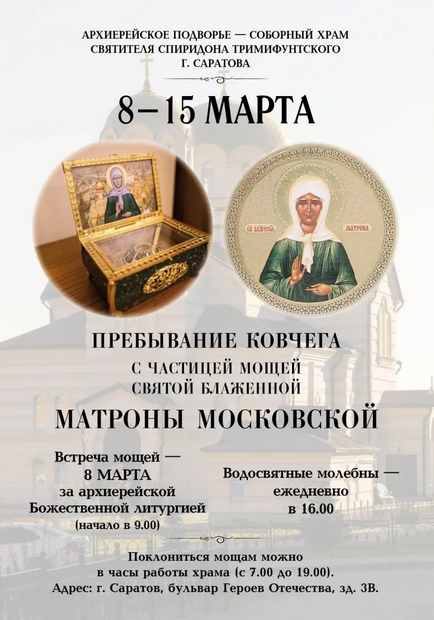 С 8 по 15 марта в соборном храме святителя Спиридона Тримифунтского г. Саратова будет пребывать ковчег с частицей мощей блаженной Матроны Московской